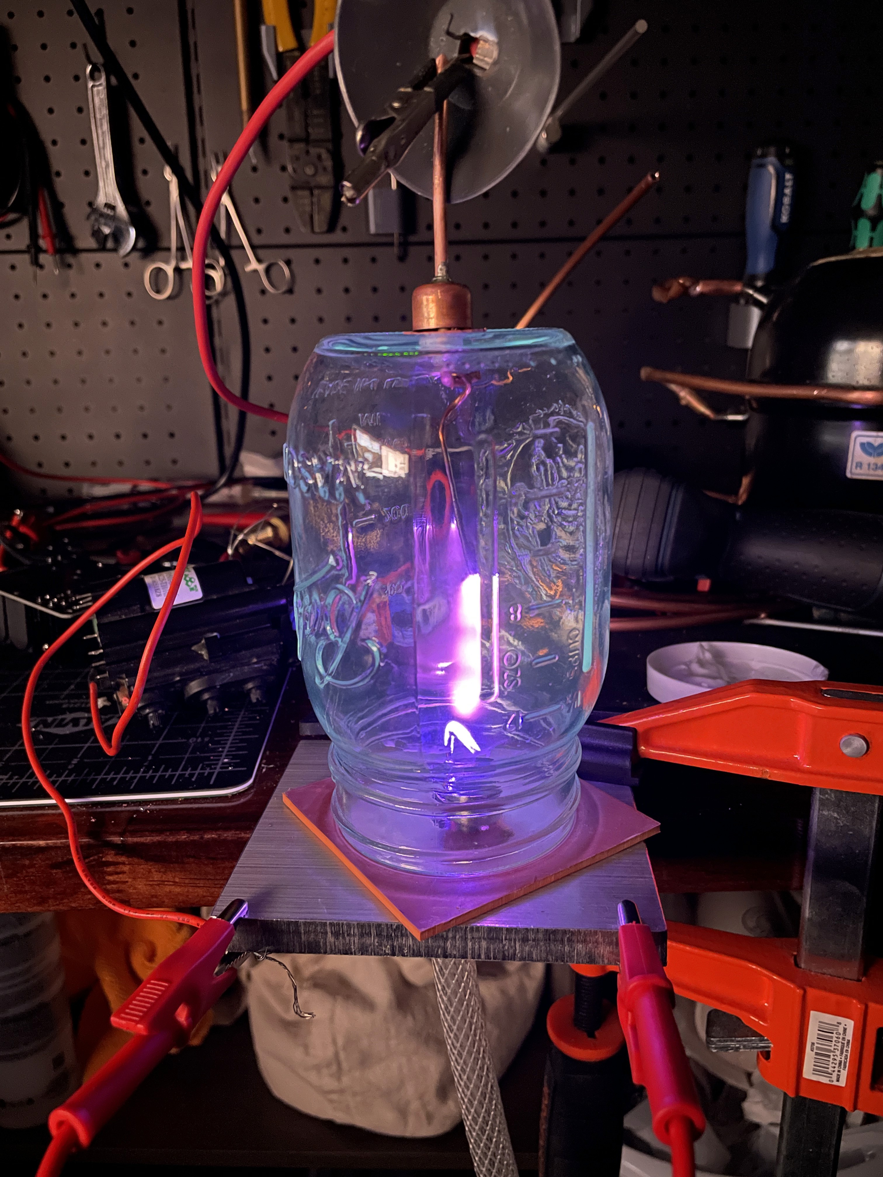 Hooked up via a machined top plate to a mason jar with epoxy potted electrical feed through or copper plug, I pulled my first vacuum and demonstrated low pressure arc discharge.