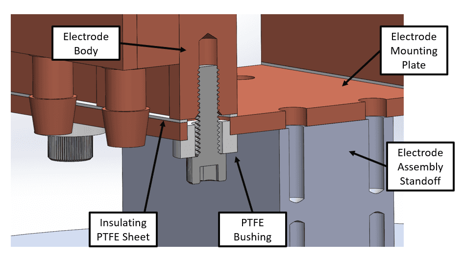 To achieve electrical isolation while bolting the assembly together, two different insulators were needed. A PTFE sheet is used to prevent the body from directly touching the electrode mounting plate. To prevent the bolt from shorting the two together, custom PTFE bushings are used to isolate the bolt from the mounting plate.