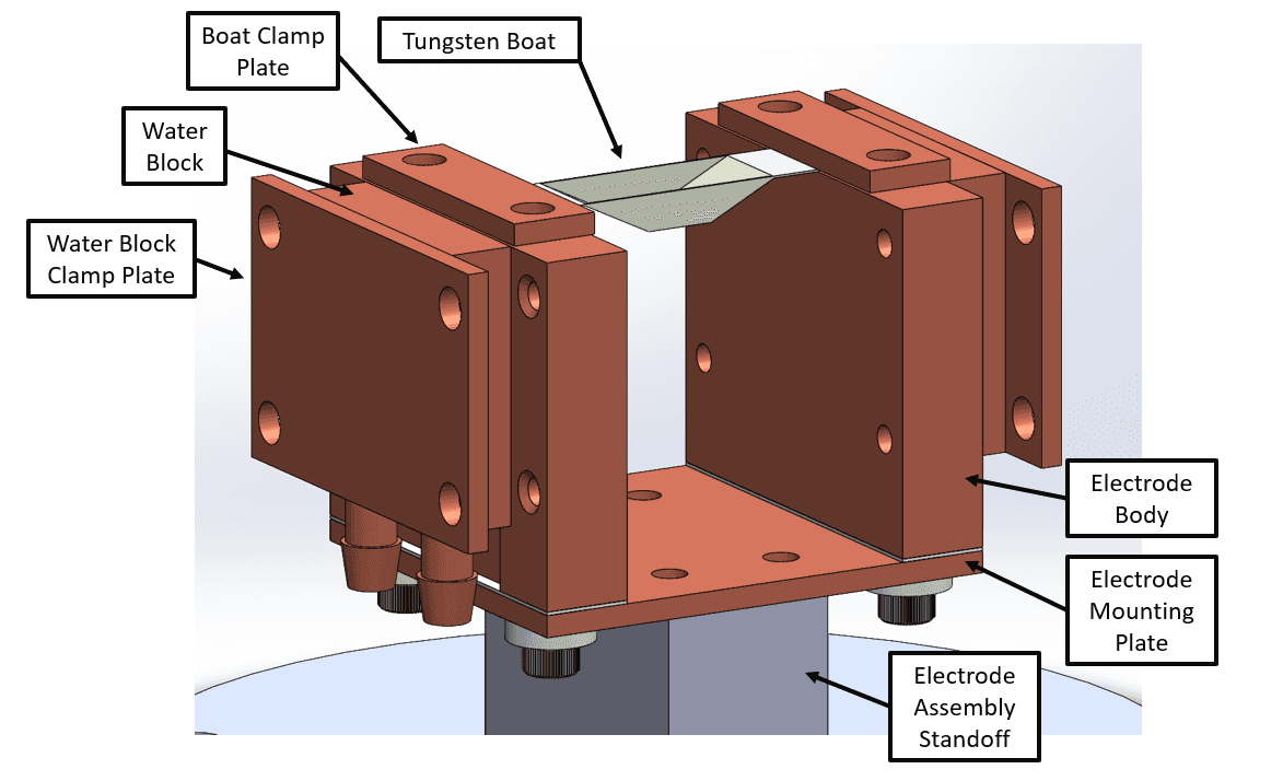 The result of these constraints is the below design. The two electrodes are identical and mirrored across the centerline. Each electrode has a primary body that attaches the tungsten boat via a clamp plate on the top, the water block via a clamp plate on the back, and the mounting plate on the bottom. All parts were made out of (scrap) copper where possible for a high thermal mass and conductivity.
