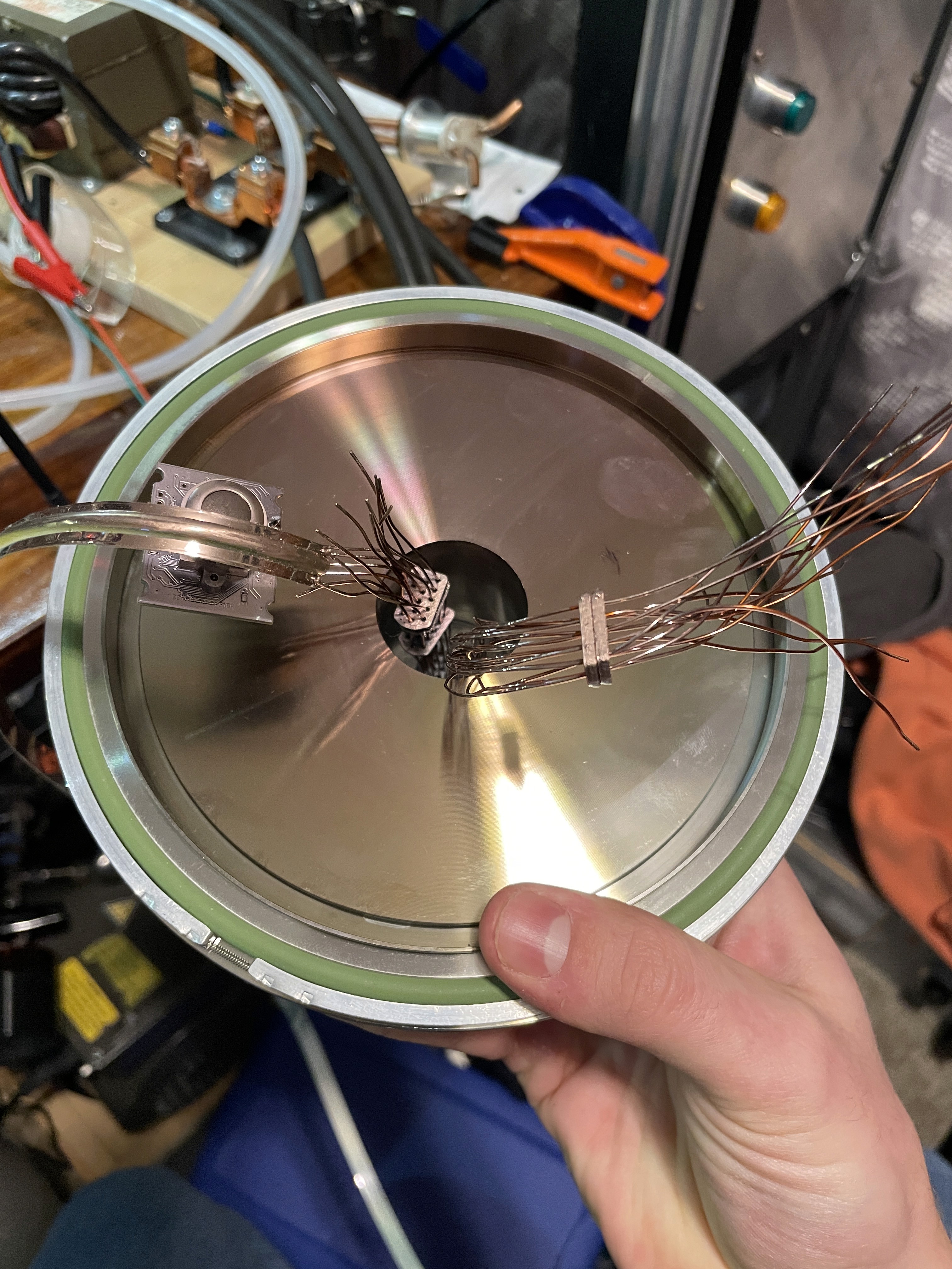 The flange started as an ISO160 to KF-16 adapter but had some major changes made to it. Two additional KF-16 ports were welded into the flange to fit the two high current feedthroughs. Additionally, stainless hose barbs were welded through the flange to allow coolant in and out. The central port is currently used for the vacuum gauge, but is planned to eventually be used as a port for custom rotary feedthrough. This will allow me to "shutter" the sputtering and thus have much greater control over the process.