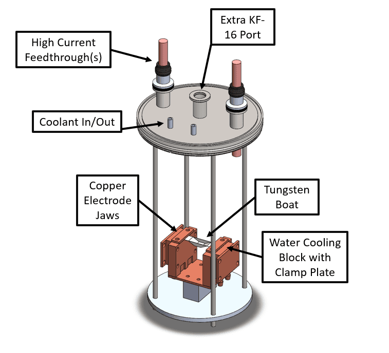 In order to pass current through this boat, I would need a fixture that could withstand the extreme temperatures. I did not want to risk melting my electrodes or be limited by run time so early on decided that I would build a water cooling system for the jaws. This would be quite the challenge as I had to get pressurized water into and out of the chamber without leaking into the sensitive vacuum system.